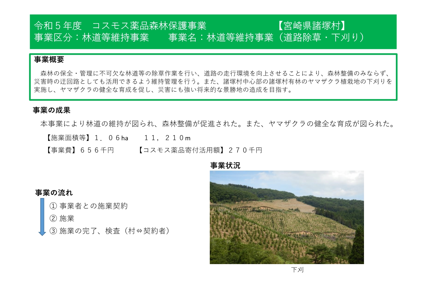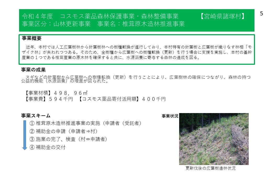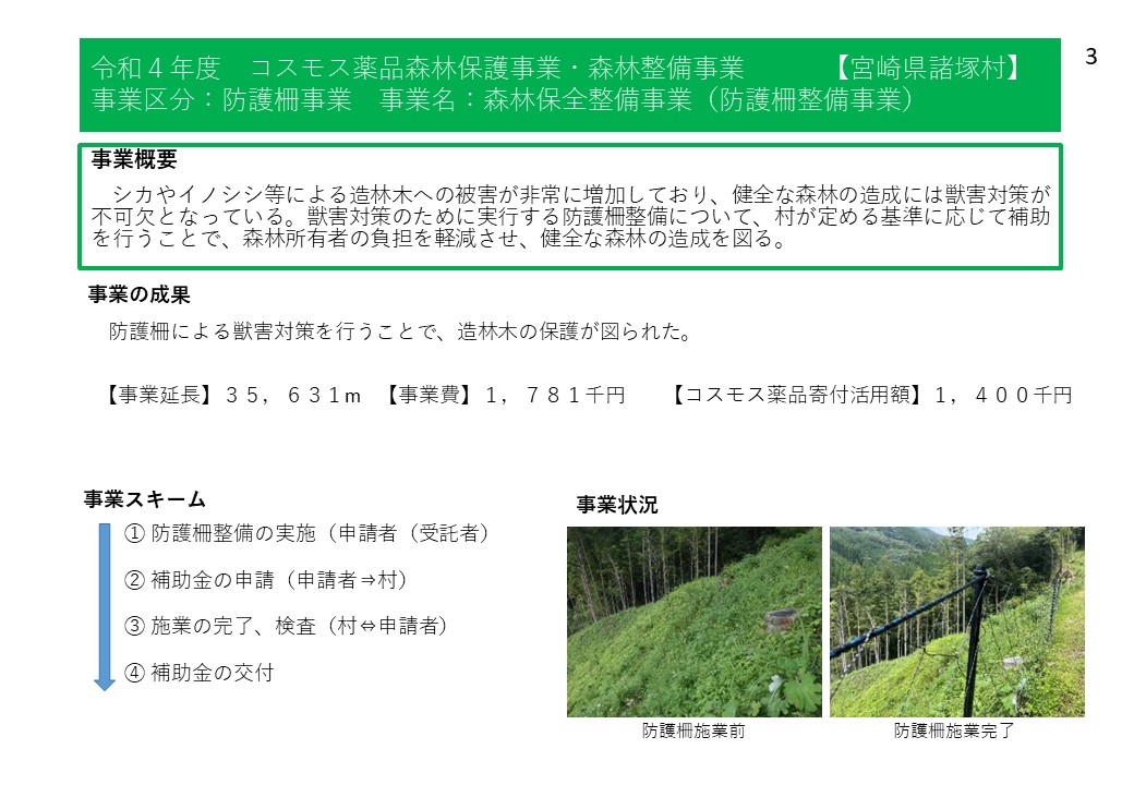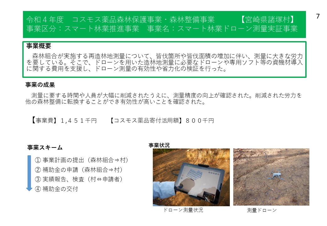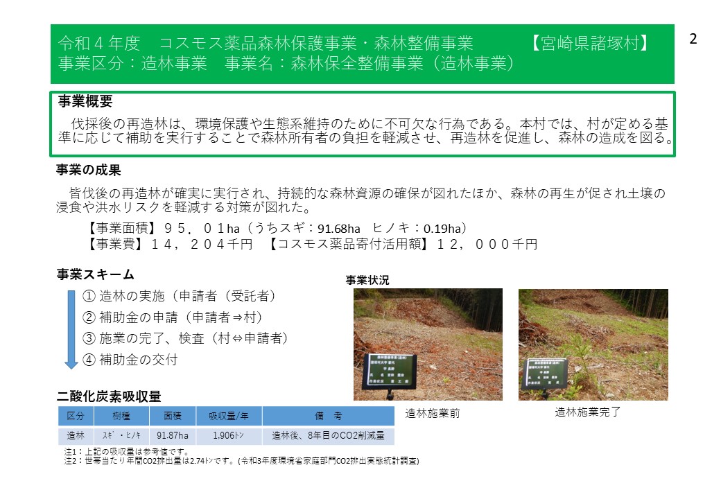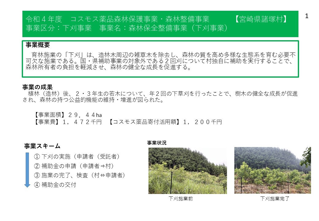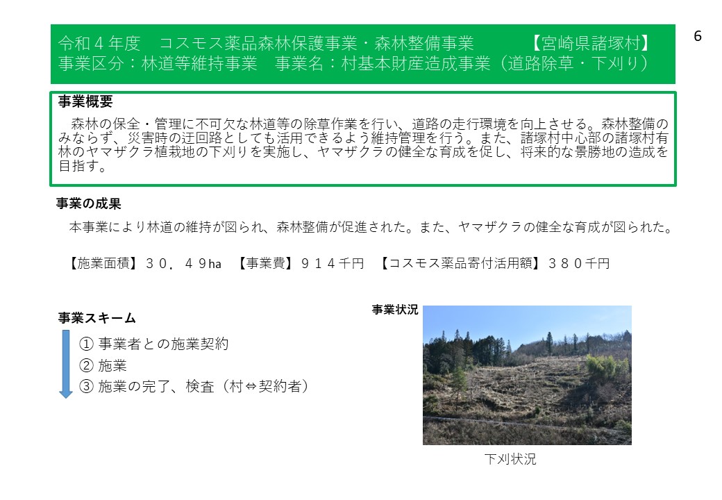 諸塚村では、令和4年度から株式会社コスモス薬品様からの寄附の支援をいただいており、森林整備事業や林業担い手育成事業、林道等維持事業等に活用しています。