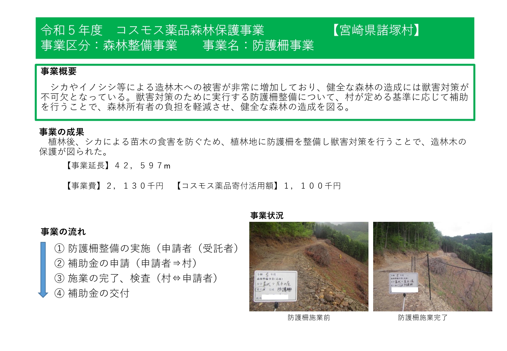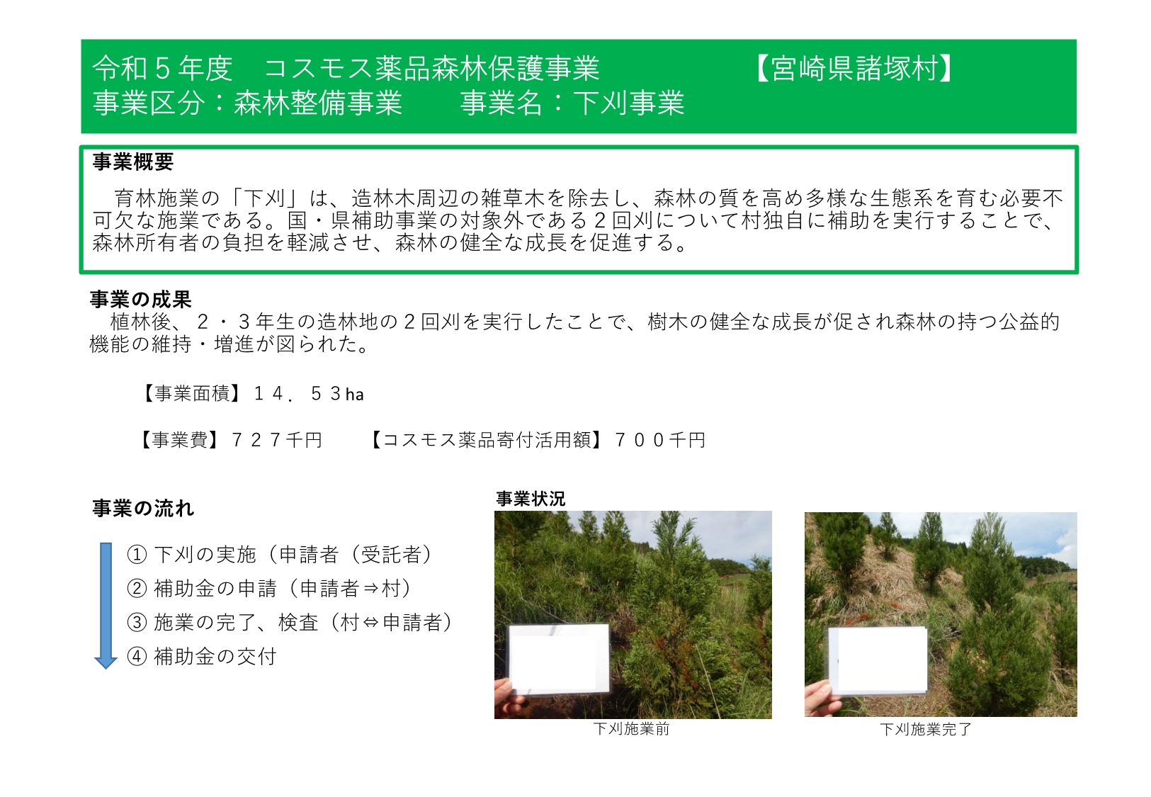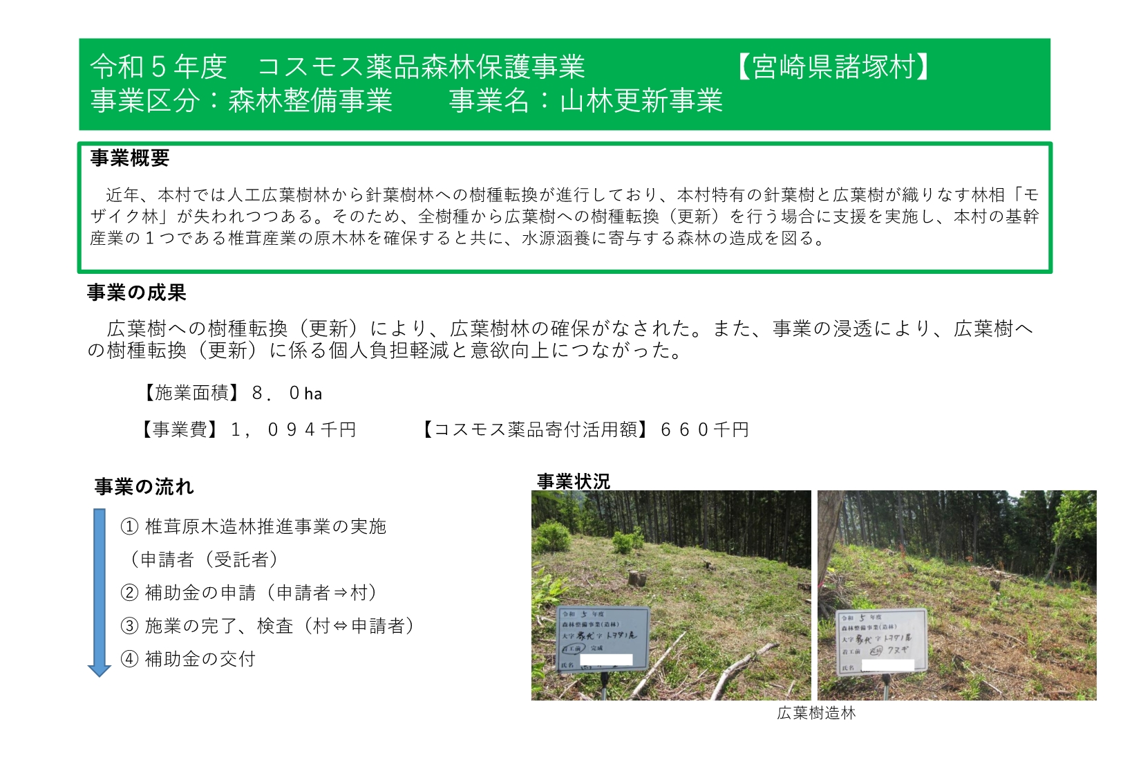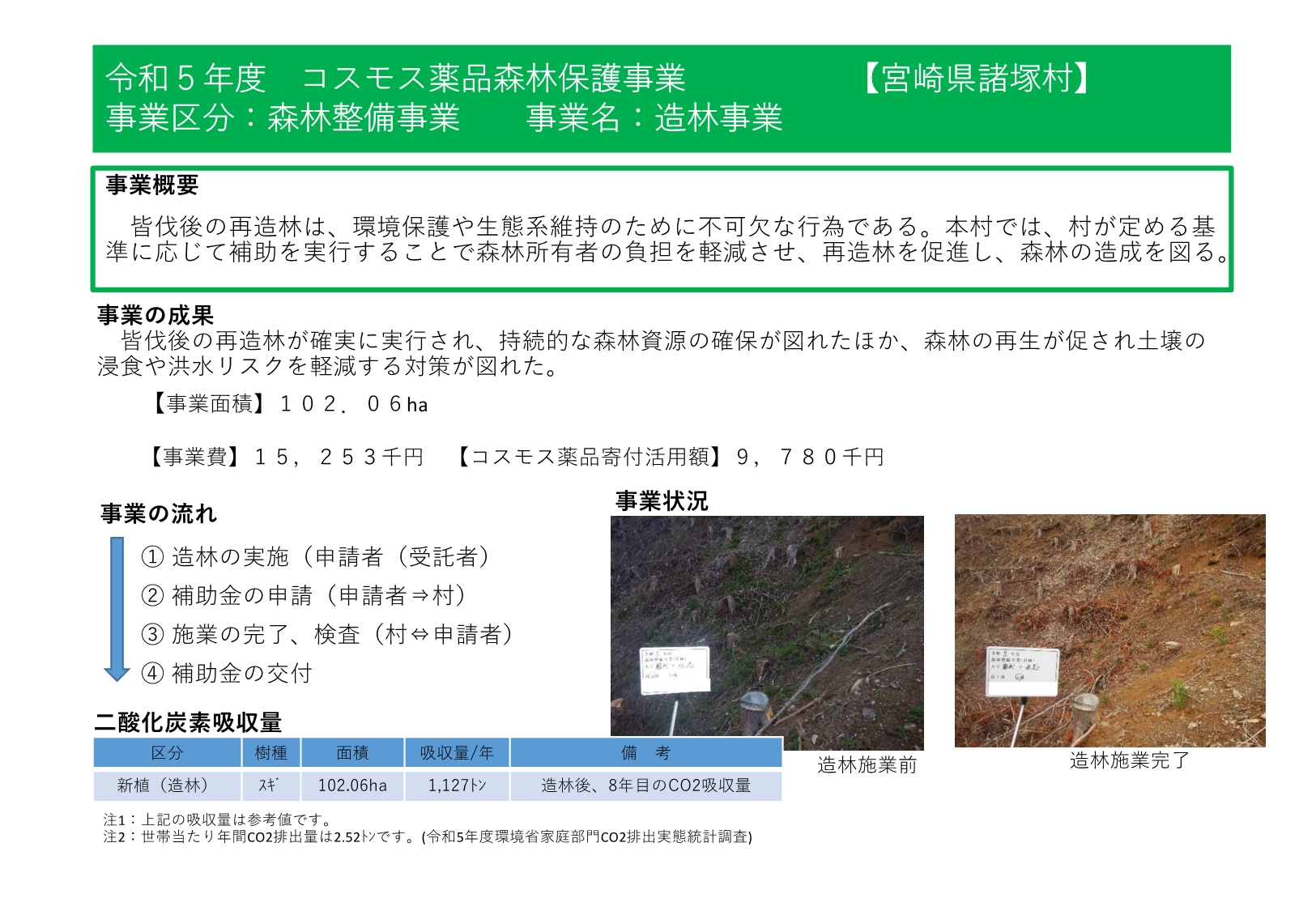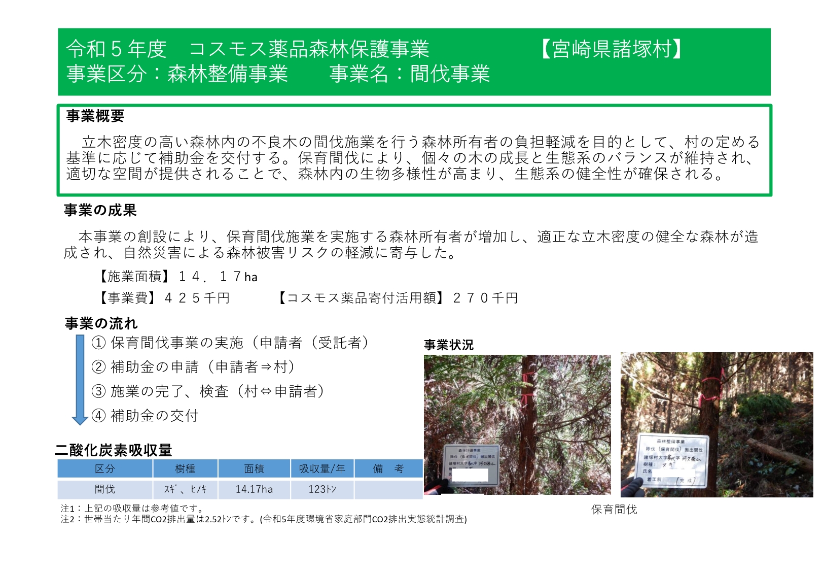 諸塚村では、令和4年度から株式会社コスモス薬品様からの寄附の支援をいただいており、森林整備事業や林業担い手育成事業、林道等維持事業等に活用しています。